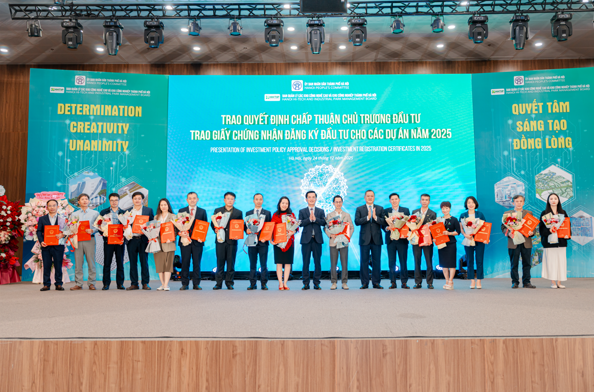 Ban Quản lý trao quyết định chấp thuận chủ trương đầu tư, giấy chứng nhận đăng ký đầu tư cho các dự án triển khai tại khu công nghệ cao và khu công nghiệp trên địa bàn TP Hà Nội năm 2025.